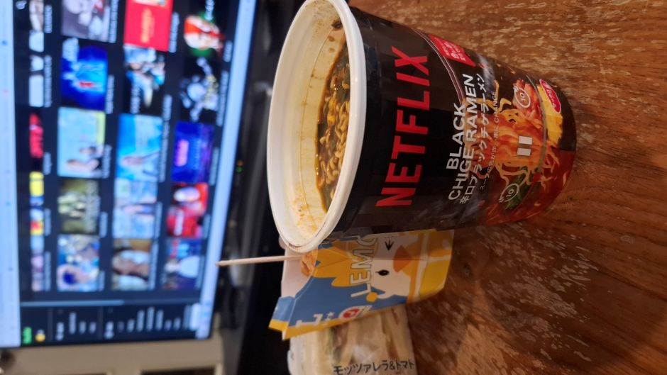 Als erstes probierte ich die 3-Minuten-Terrine. Ist am längsten her, deshalb am wenigsten im Gedächtnis. Da ich aber das Experiment nicht gleich danach abgebrochen habe, gehe ich davon aus, dass sie recht süffig war. Ich erinnere mich sehr wohl, dass ich ein Foto vor dem Hintergrund der Bedienoberfläche des Netflix-Konkurrenten Hulu geknipst habe (Abb. oben), für ein launiges Jux-Posting in den sozialen Medien. Unter uns kann ich es ja verraten: Das Foto ist gestellt. Ich habe zur Netflix-Suppe sehr wohl Netflix geschaut. Hulu ist voller Filme, die man unbedingt „irgendwann mal“ gucken möchte, nur kommt dieses Irgendwann halt nie. Und wenn doch, dann ist bis dahin garantiert der Film wieder weg, denn nichts streamt ewiglich. Und dann kichern die unverbesserlichen Scheibenhorter gehässig in ihre Fäustchen und sagen: „Hab ich doch gesagt.“ Darauf antworte ich lediglich mit einem sehr erwachsenen Geräusch, mit meiner Zunge zwischen meinen Lippen produziert.
