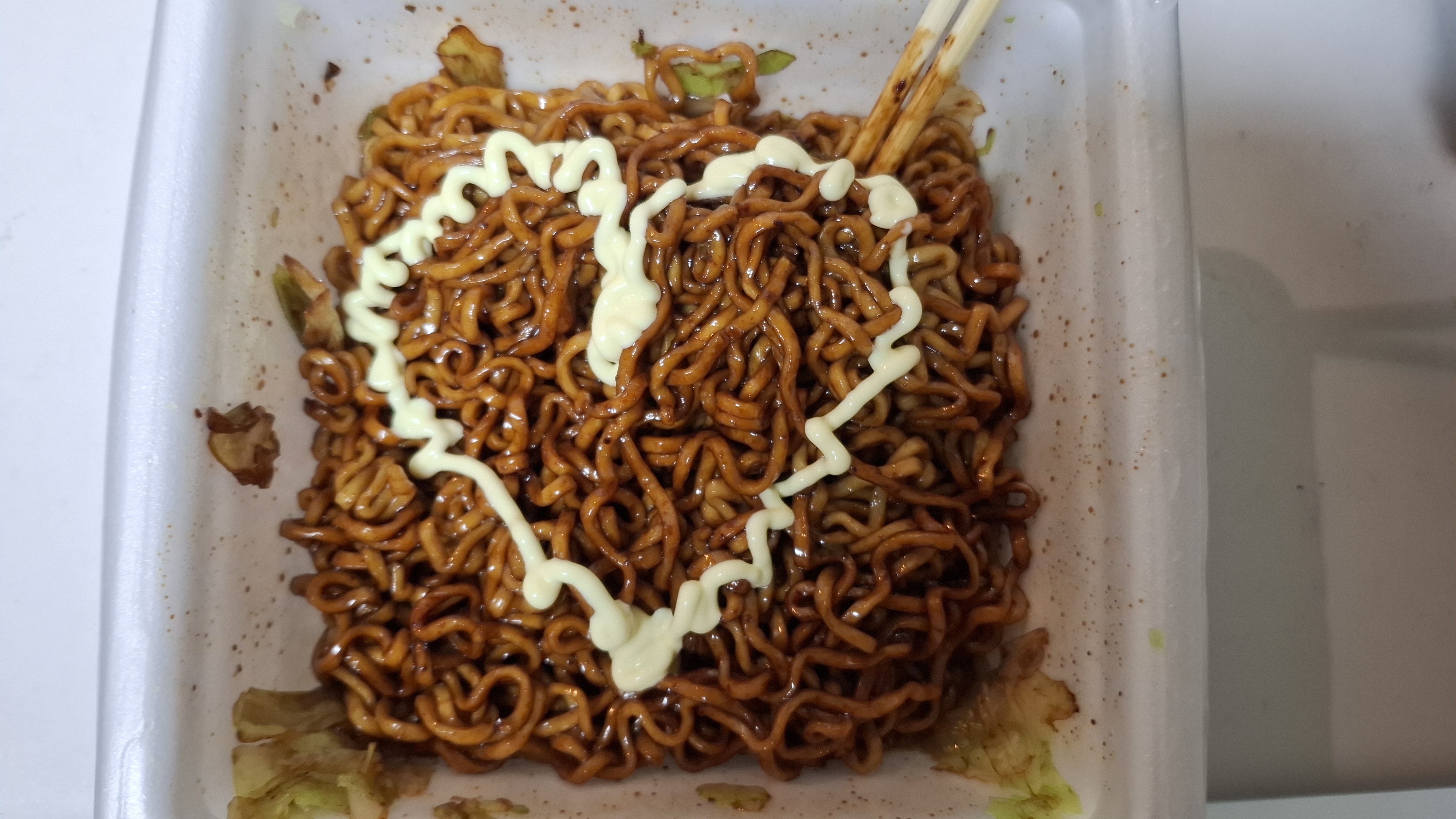 Mazesoba steht drauf, aber es handelt sich eher um hundsgemeines Yakisoba, so etwas wie die japanische Bratwurst im Brötchen. Gehört zu Volksfesten irgendwie dazu, also isst man es, ohne groß einen Gedanken daran zu verschwenden, ob es einem nun Genuss bereitet oder nicht. Hauptsache Bier dabei und Getöse umzu. Und warum auch nicht. Hat natürlich zu Hause ohne Bier und Getöse nicht dieselbe Strahlkraft.