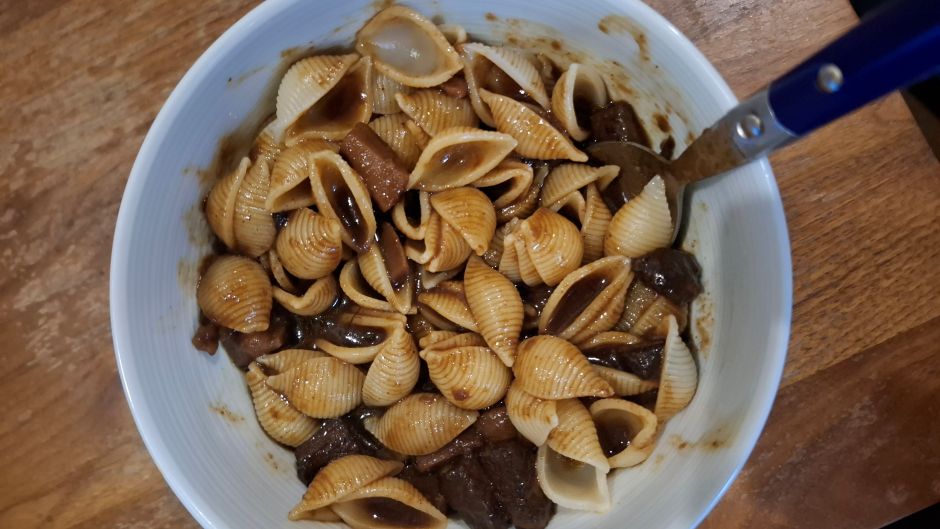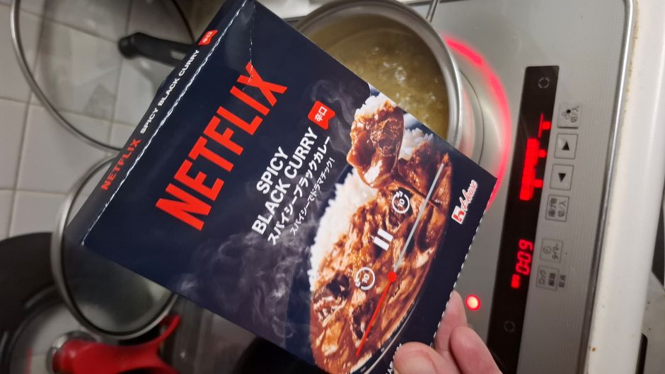 Mein Netflix-Gastro-Favorit ist vielleicht das Curry aus dem Kochbeutel. Ich habe es natürlich nicht mit Reis zubereitet, denn wer mag schon Reis. Ich habe es zur Pastasauce umfunktioniert. Küchen-Hack der Spitzenklasse: Einfach den Kochbeutel im Nudeltopf mitkochen lassen. Spart Topf, Wasser und Strom.